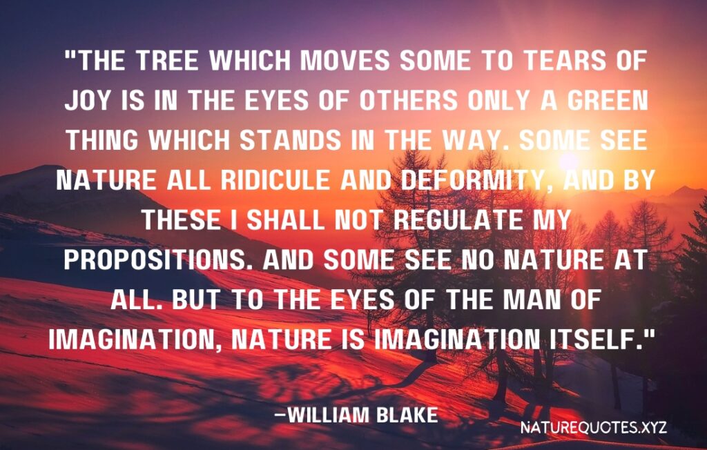 “The tree which moves some to tears of joy is in the eyes of others only a green thing which stands in the way. Some see nature all ridicule and deformity, and by these I shall not regulate my propositions. And some see no nature at all. But to the eyes of the man of imagination, nature is imagination itself.” –William Blake