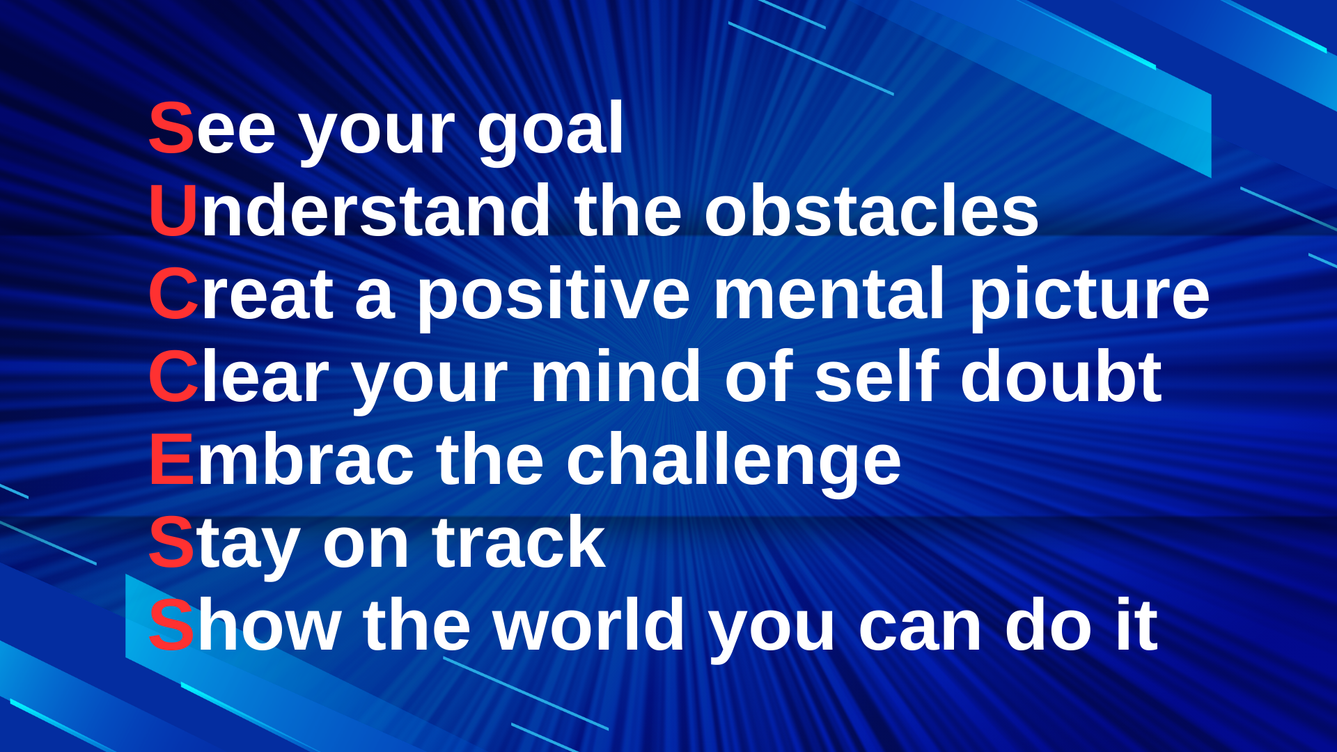 See your goal , understand the obstacles, create a positive mental picture, clear your mind of self doubt, embrace the challenge, stay on track,show the world you can do it.