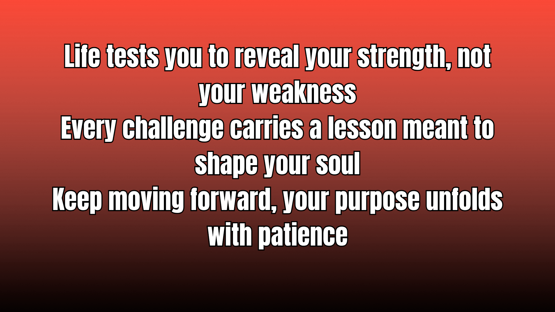 Life tests you to reveal your strength, not your weakness. Every challenge carries a lesson meant to shape your soul, keep moving forward, your purpose unfolds with patience.